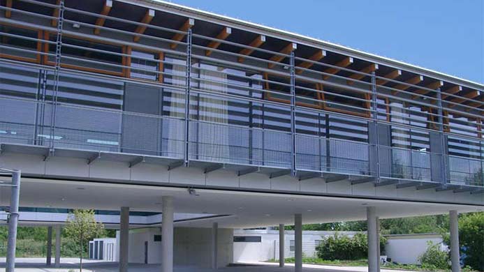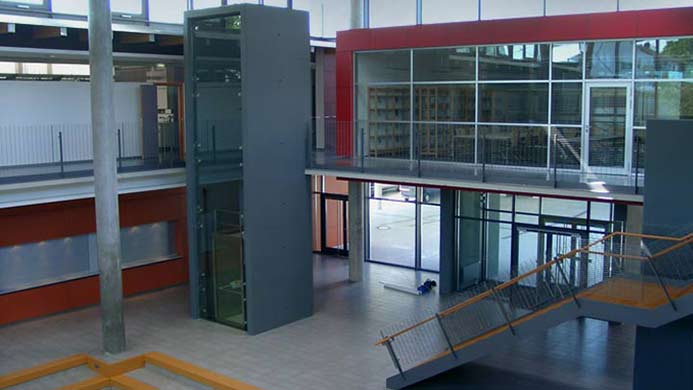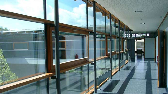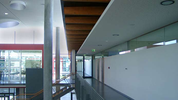 Die mit großzügigen Oberlichtern ausgestattete Aula stellt sowohl die räumliche, als auch die kommunikative Mitte der Schule dar. Das gesamte Obergeschoss erhält einen Umgang, der als Rettungsweg dient. Die Winkel der Lamellen an der Sonnenschutzanlage sind so berechnet, dass im Sommer die notwendige Verschattung gegeben ist, im Winter dagegen ein Maximum an "passiver Solargewinnung" erzielt wird.
