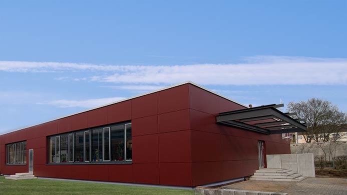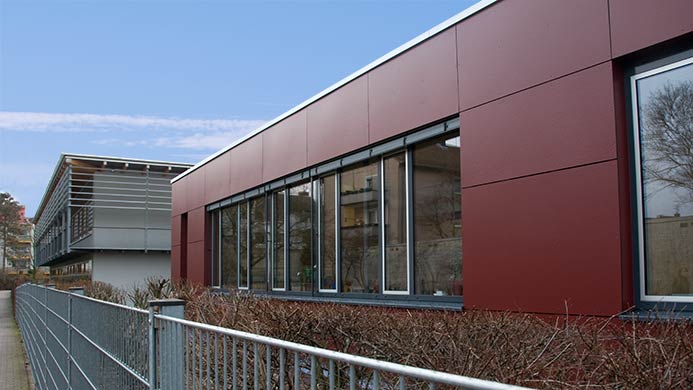 So erhält dieses Gebäude eine einladende, freundliche Atmosphäre, die durch viel Tageslichteinfall geprägt ist. In Anlehnung an den Verwaltungs-bau (Bauteil B) erhält die Fassade großformatige Eternitplatten.