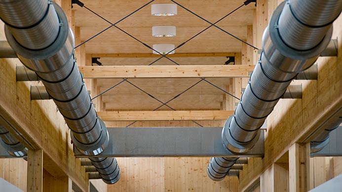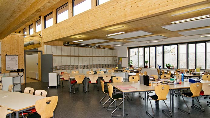 Die Klassenräume erhalten eine hohe Verglasung. Tragende Wände und Decken bestehen aus einer Holzbau-konstruktion in Kreuzlagenbauweise. Die Flurtrennwände werden in Trockenbauweise errichtet und erhalten ein durchlaufendes Oberlicht. Der innen liegende Flur wird mittels einer beidseitig verglasten „Laterne“ mit Tageslicht versorgt.