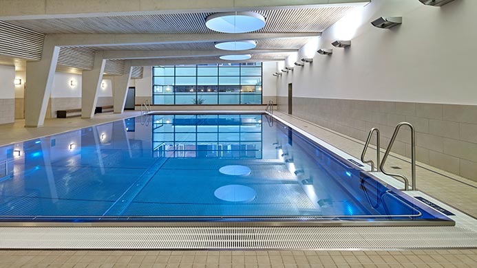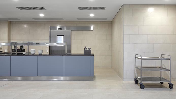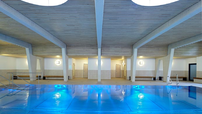 Im Erdgeschoss befinden sich folgende Bereiche: Halle und Empfang, Café mit Nebenräumen, Küche mit Personal und Patientenspeisesaal, alle Lager- u. Kühlflächen, Therapieeinrichtung (Schwimmbad, Turnhalle, Krankengymnastik, Gruppentherapieräume), alle dazugehörigen Lagerflächen, Logistische Einrichtungen (Hauspersonal, Lager, etc.), Andienung aller haustechnischen Dienste, alle Umkleidebereiche für Küchen-, Hauspersonal und Pflegedienste, Aufent-haltsbereiche für Patienten.
