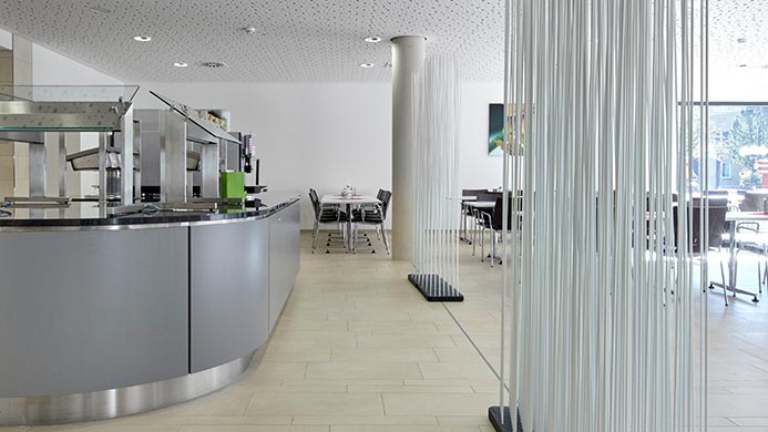 Südlich der Aufzugsgruppen und damit in der geometrischen und verkehrstechnischen Mitte des Gebäudes, ist in jedem Geschoss ein Auf-enthaltsraum angeordnet. Im Untergeschoss befinden sich die gesamten Technikzentralen für alle Bereiche und ein Teil der Lagerflächen für die Haustechnik.