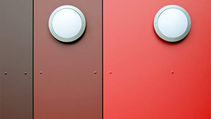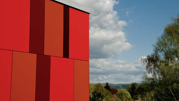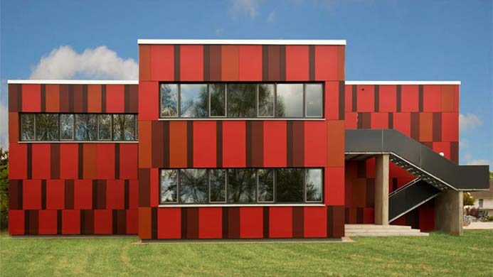 Die Fassade besteht aus großformatigen Fassadenplatten, deren Fassadentafeln in 4 Größen unterteilt sind und je eine eigene Farbe haben. Das Dach ist extensiv begrünt.