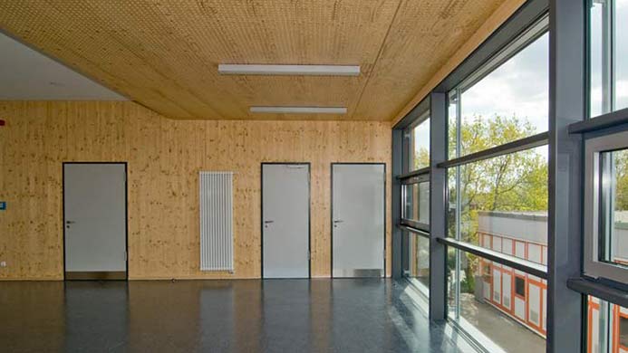 Der Erweiterungsbau verfügt über eine einladende und freundliche Atmosphäre, die durch viel Tageslichteinfall geprägt ist. Alle Klassenräume erhalten auf einer der vier Wandseiten eine großflächige Verglasung in Form eines durchlaufenden Fensterbandes. Die tragende Wände und Decken sind als Holzbaukonstruktion errichtet. Das Holz der Flurtrennwände bleibt sichtbar.