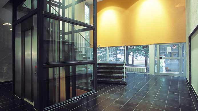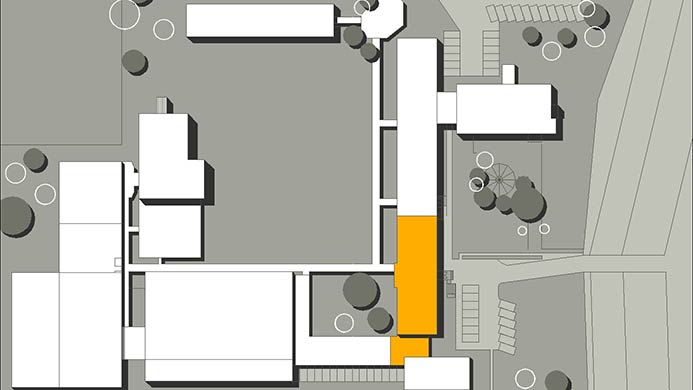 Das gesamte Gebäude wird behinderten-gerecht umgebaut. Hierzu gehören das Schaffen barrierefreier Zugänge und der Einbau einer Aufzugsanlage, die als Stahl-Glas-Konstruktion ausgeführt wird.