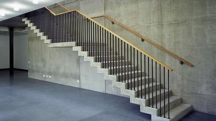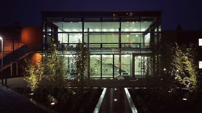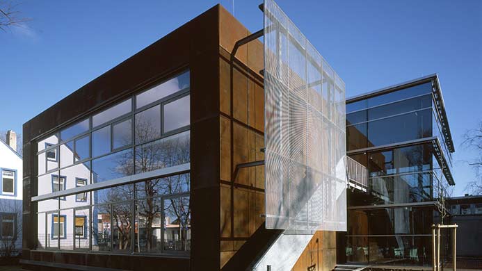 Die Fassade wird in Anlehnung an die Ausbildung im Gold- und Silber-schmiedehandwerk als Metallfassade aus Cortenstahl ausgeführt. Um trotz der großflächigen, südorientierten Vergla-sung auf eine Klimaanlage verzichten zu können, wurde für den Neubaubereich eine dynamische Gebäudesimulation durchgeführt, in der alternative Maß-nahmen zur Kühlung des Gebäudes entwickelt wurden.