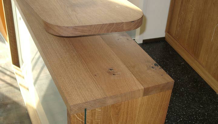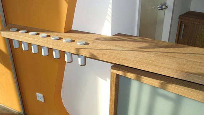 Wesentliches Gestaltungsmerkmal sind die spielerisch, organisch gebogenen Wände, die mit kräftigen Farben angelegt sind. Diesen expressiven Elementen haben wir als Gegenpol kubische, zurückhaltende Möbel aus massiver Eiche entgegengesetzt.