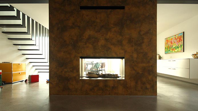 Der Grundriss des Erdgeschoss wird über einen Luftraum, in dem eine einläufige Treppe angeordnet ist, mit dem Obergeschoss verbunden.