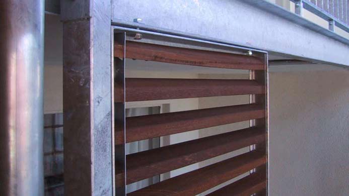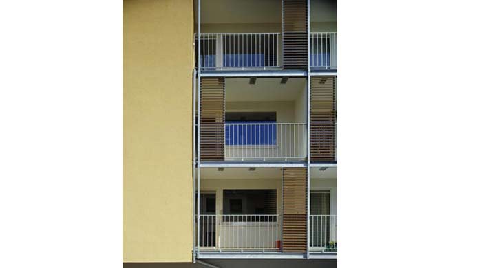 Nach Gegenüberstellung der entstehenden Kosten für eine Sanierung mit Verbleib und Instandsetzung der Brüstungsplatten gegenüber dem Abbruch und Ersatz durch eine Schlosserkonstruktion wurden die Waschbeton–Brüstungsplatten mit einer Betonsäge abgetrennt und entsorgt und durch die neue Geländekonstruktion aus Stahl und Lamellen–Elementen aus witterungsfestem Bangkirai-Holz ersetzt.